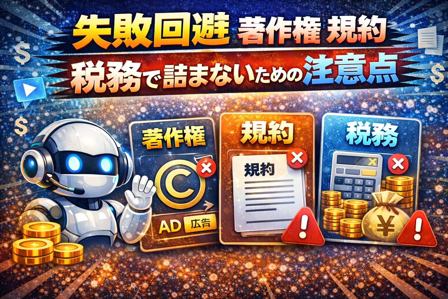具体的には、素材の商用利用可否、音声や画像の利用条件、プラットフォームのガイドライン、そして税務の管理です。