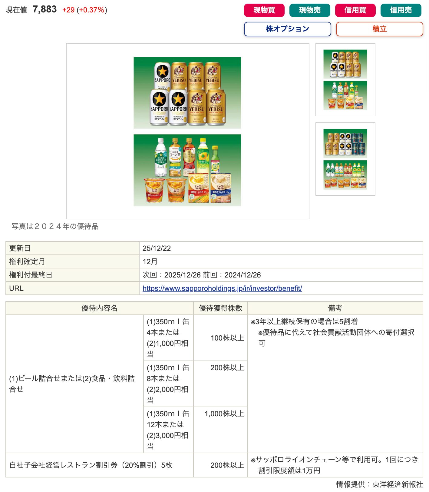 サッポロホールディングスは12月末、キリンホールディングスは12月末または保有期間条件付きなど、銘柄ごとにルールが異なります。