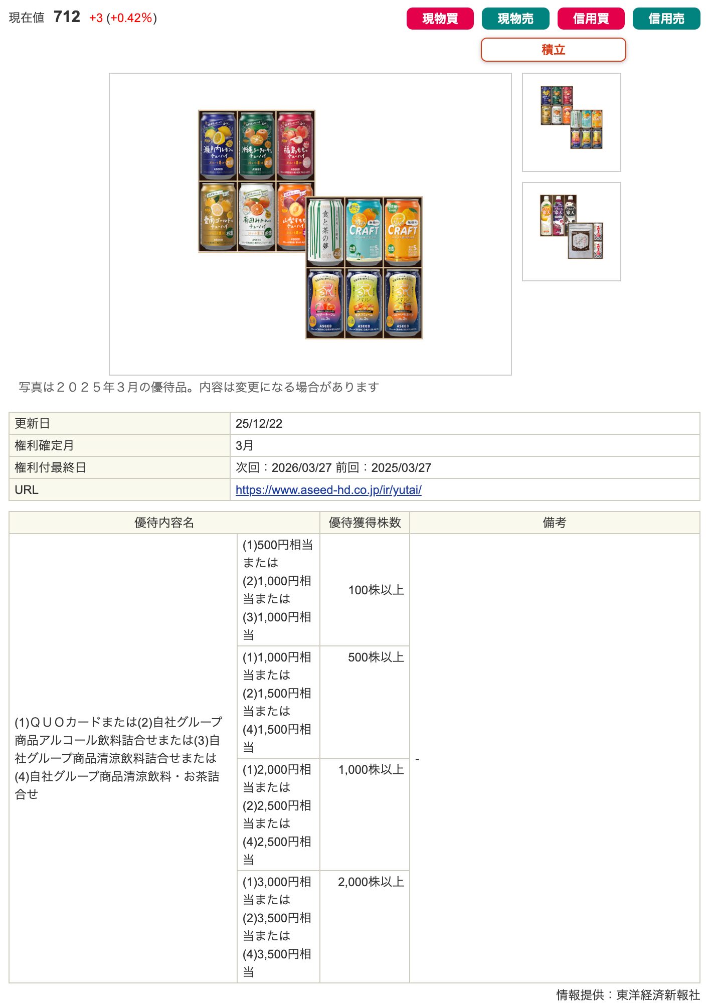 アシードホールディングスでは、チューハイや清涼飲料水を中心とした自社商品セットが株主優待として提供されています。