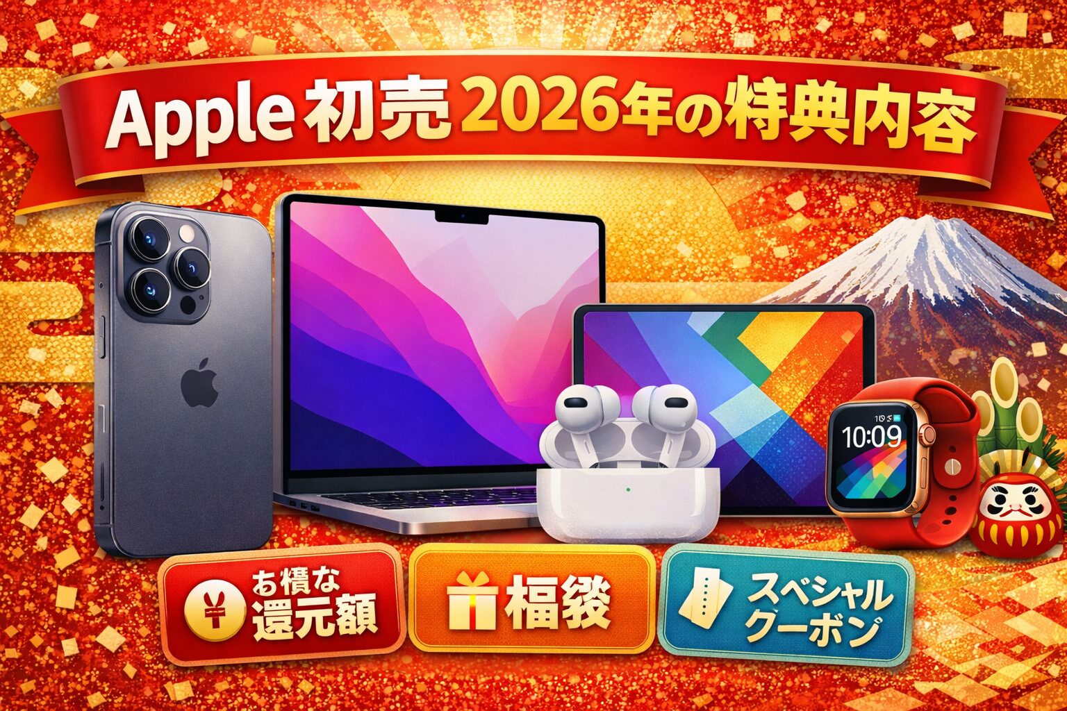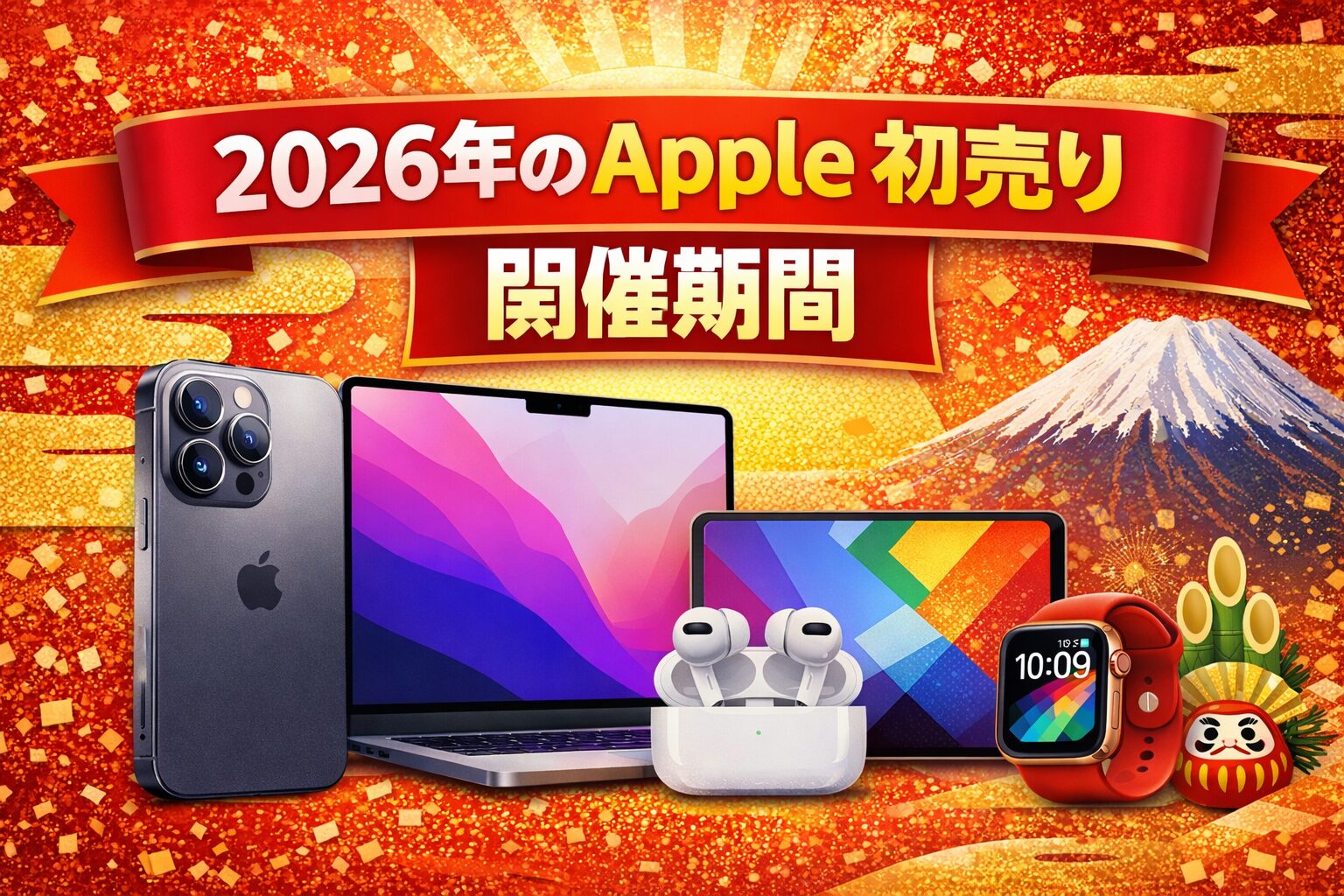 Apple 初売り 2026年では、iPhone、Mac、iPad、Apple Watch、AirPodsなど、