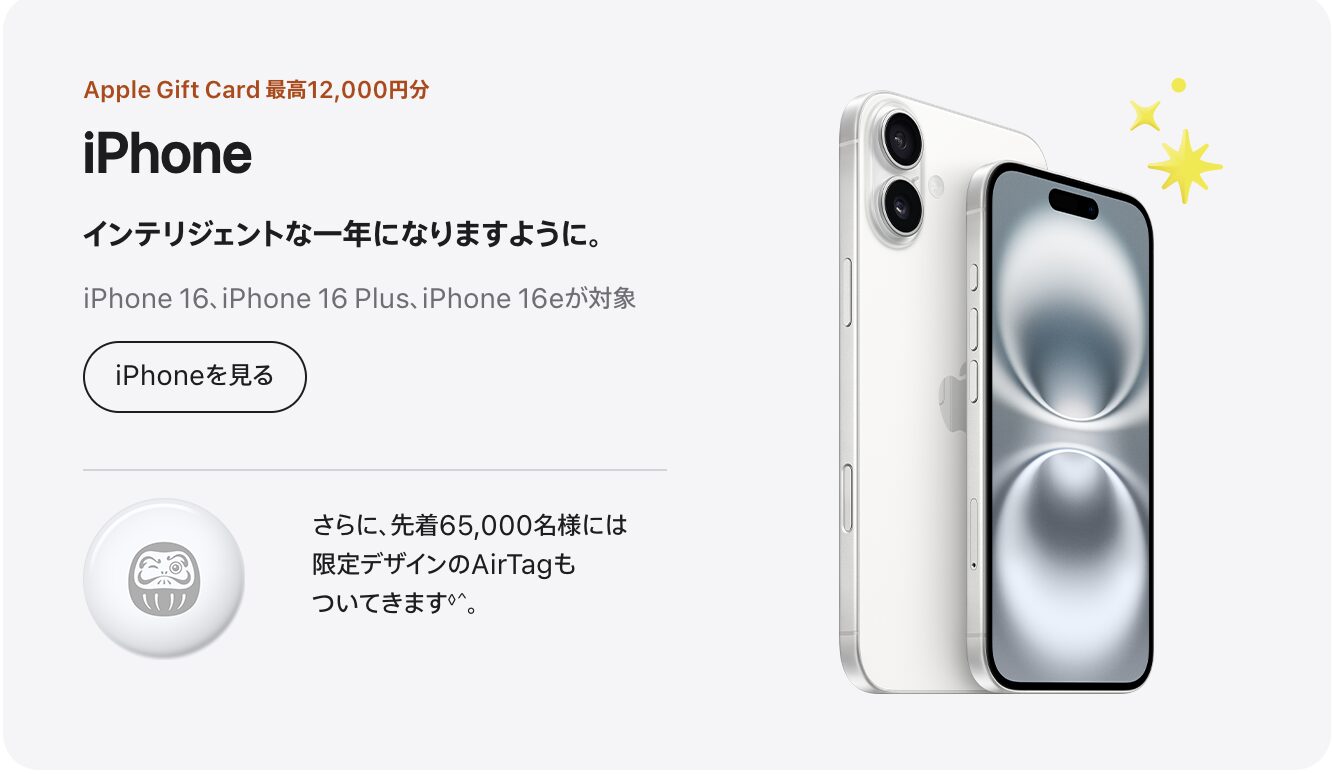 また、2026年の初売りでは、対象iPhoneを購入することで限定デザインのAirTagがもらえる特典 も用意されています。