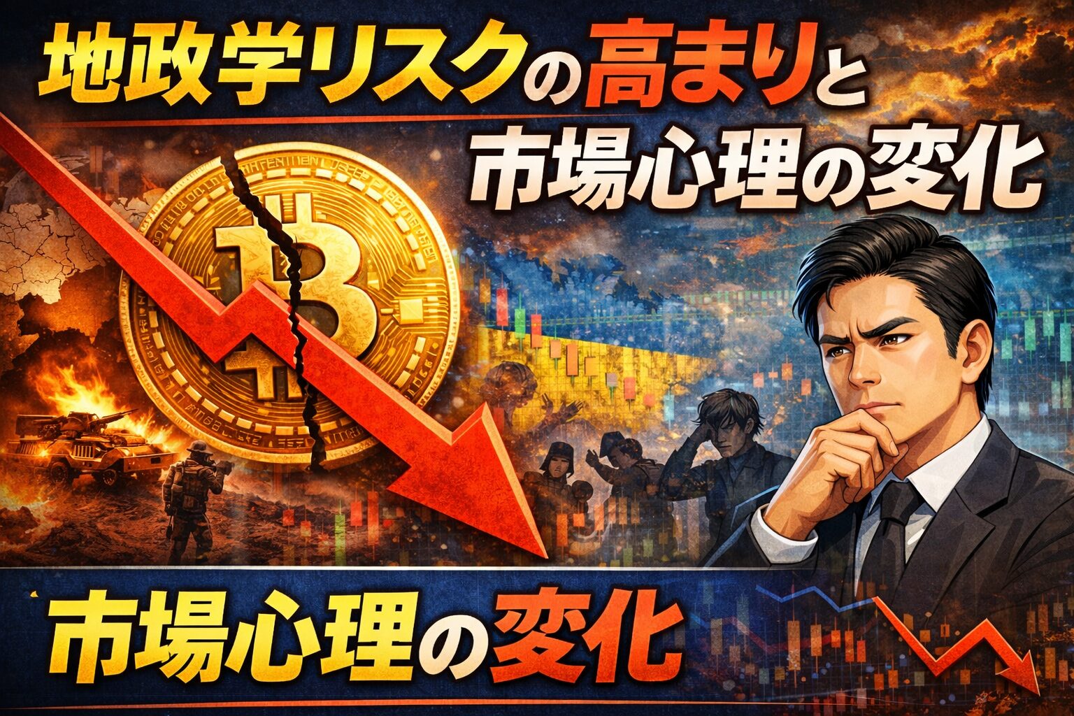 今回のビットコイン下落局面では、地政学リスクの高まりも市場心理を大きく冷やしました。