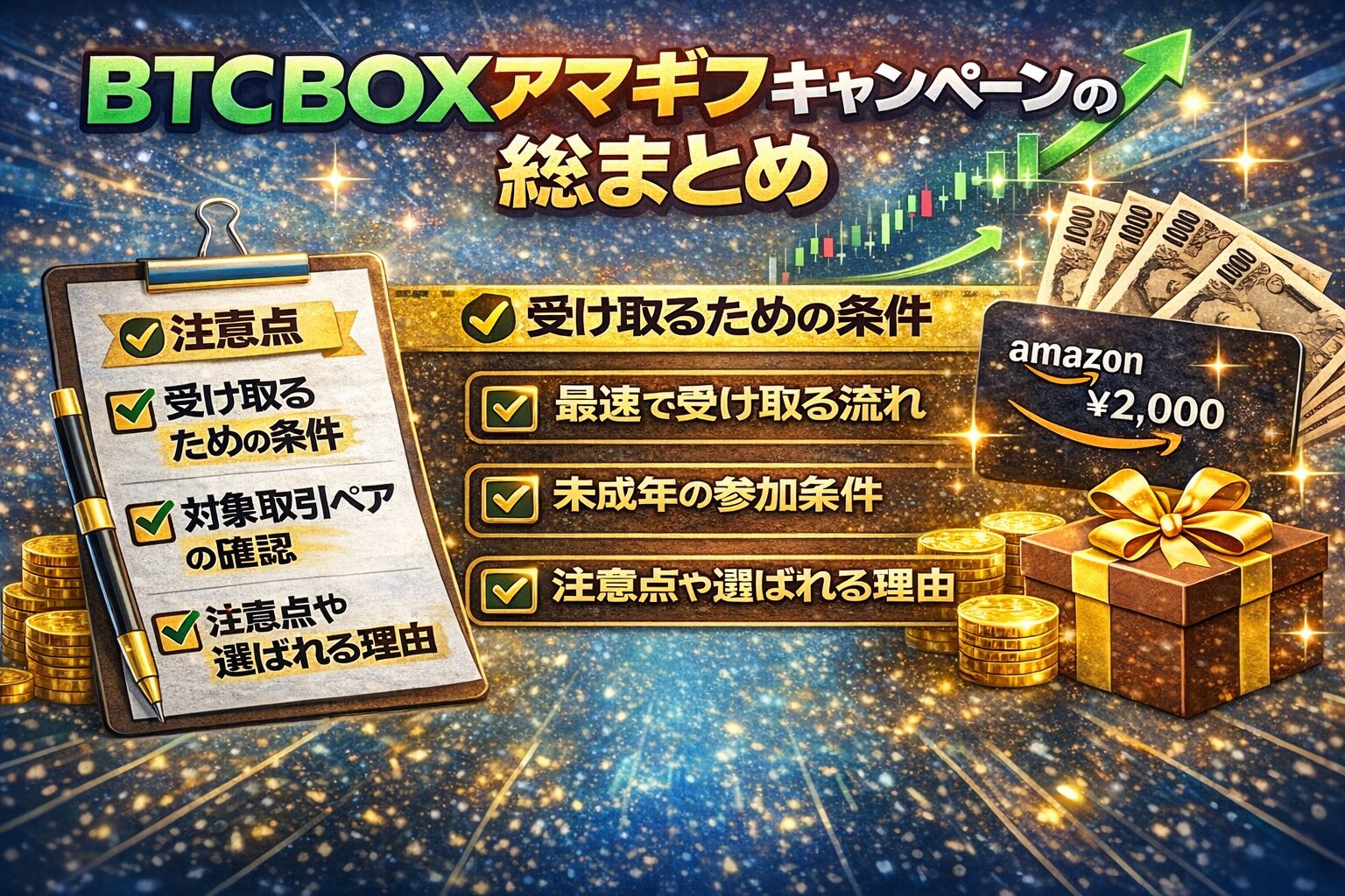 ここまでBTCBOXのアマゾンギフト2,000円キャンペーンについて、条件・手順・注意点などを徹底的に解説してきました。