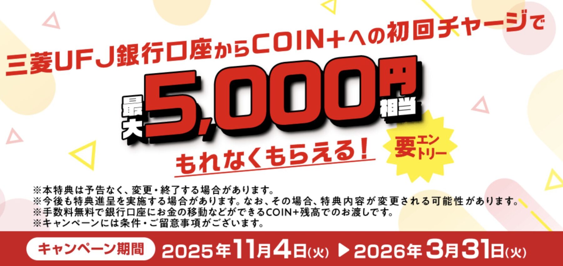 決済ブランドのCOIN+は、銀行口座との入出金や送金に紐づく仕組みのため、キャンペーンでも本人確認、口座登録、ID連携が条件に入りやすい設計です。