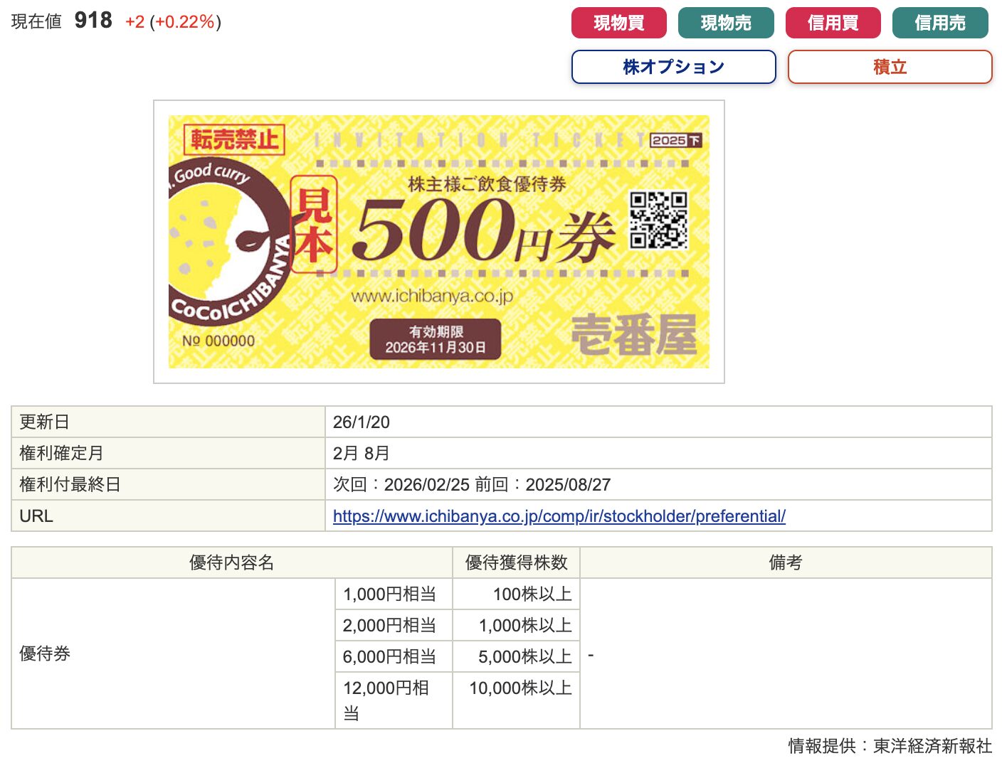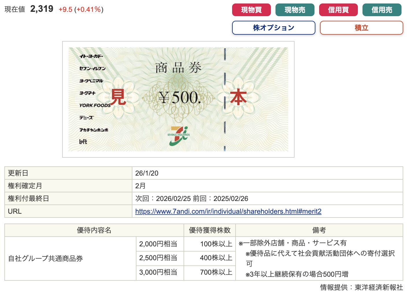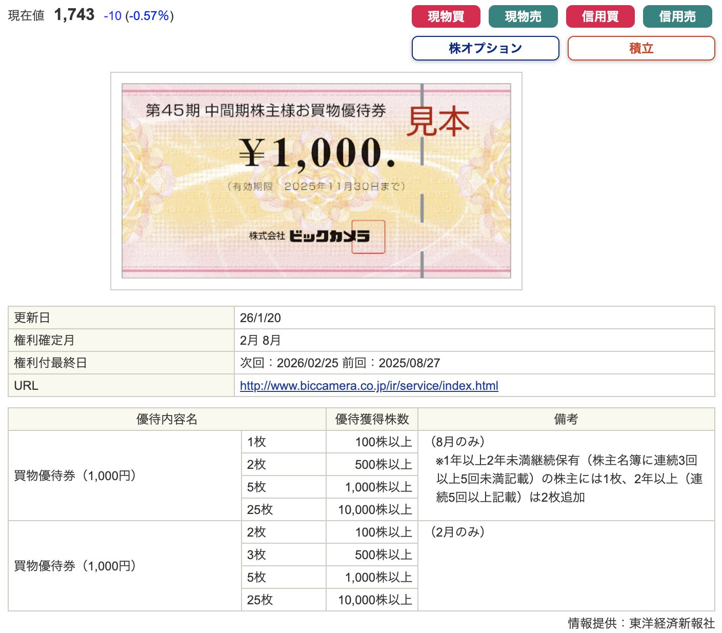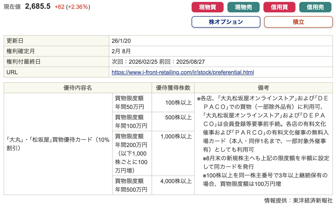 2026年2月から優待内容が拡充され、買物優待券の金額が増額されました。