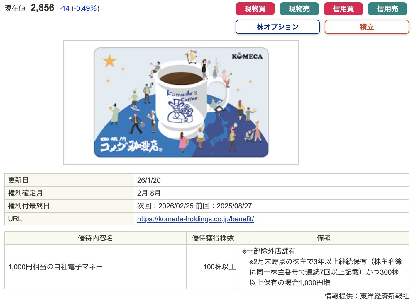 喫茶店利用に適した優待内容で、長期保有の満足度が高い銘柄です。