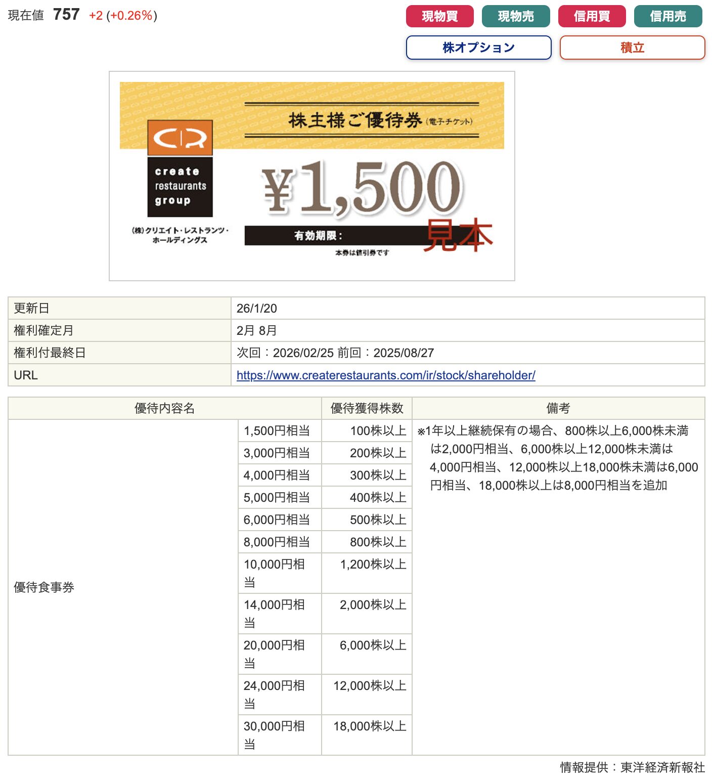 外食系では クリエイト・レストランツ・ホールディングス が優待内容を実質的に拡充しています。