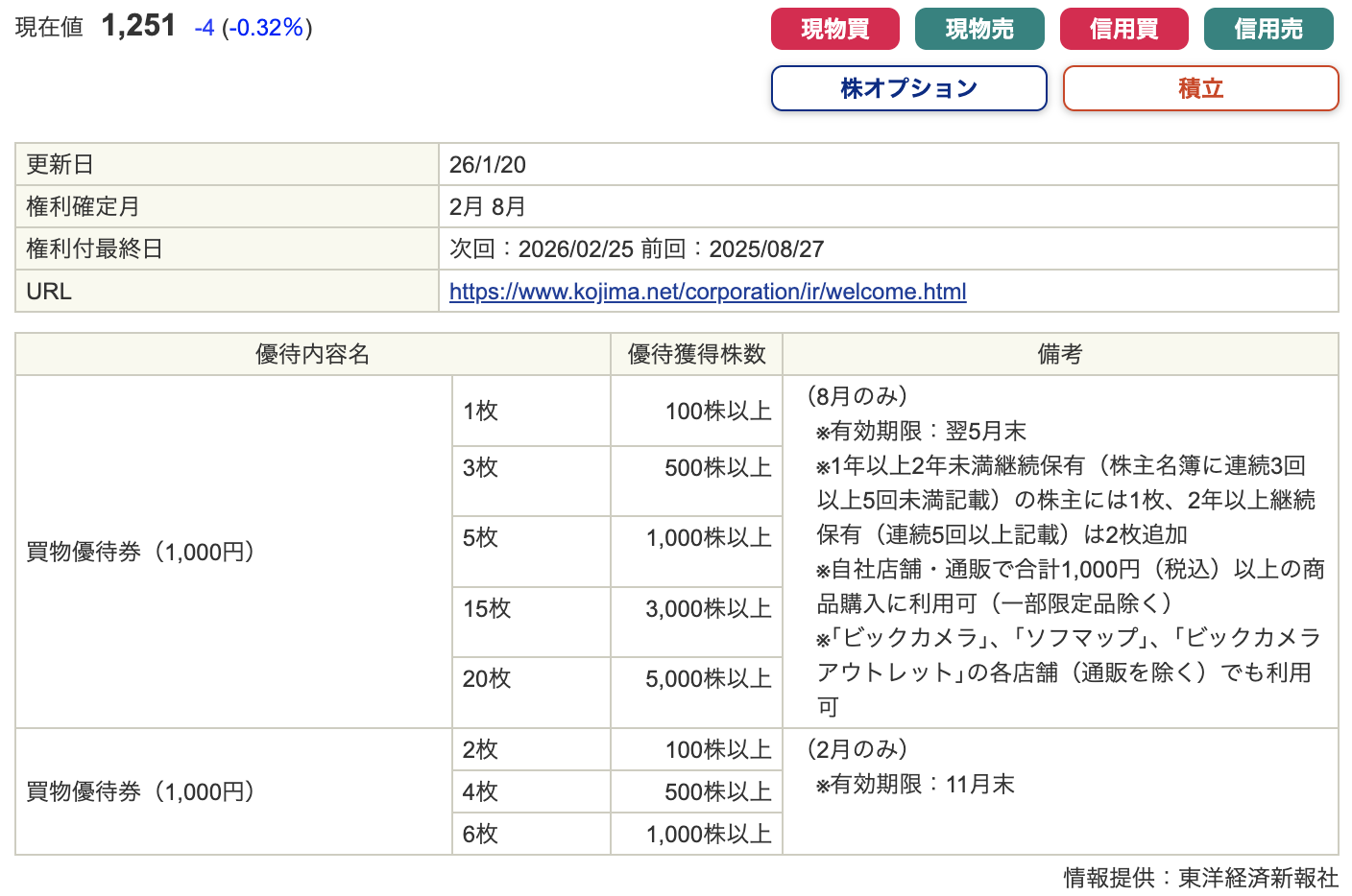 家電量販店の コジマ は、2026年2月分の優待を増額しました。