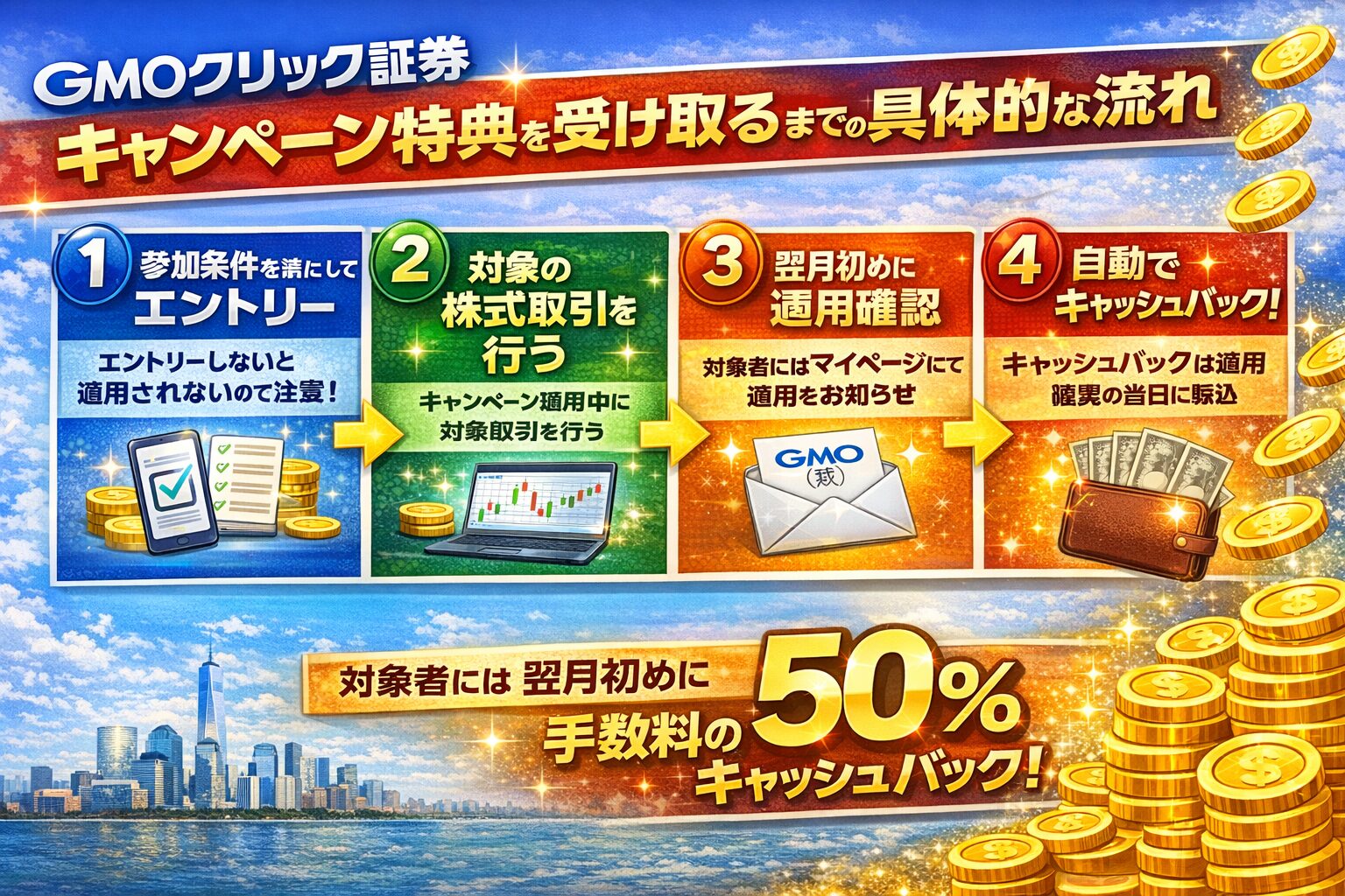 このように、GMOクリック証券のキャンペーンは、口座開設から取引、集計、特典付与という明確な流れで進みます。