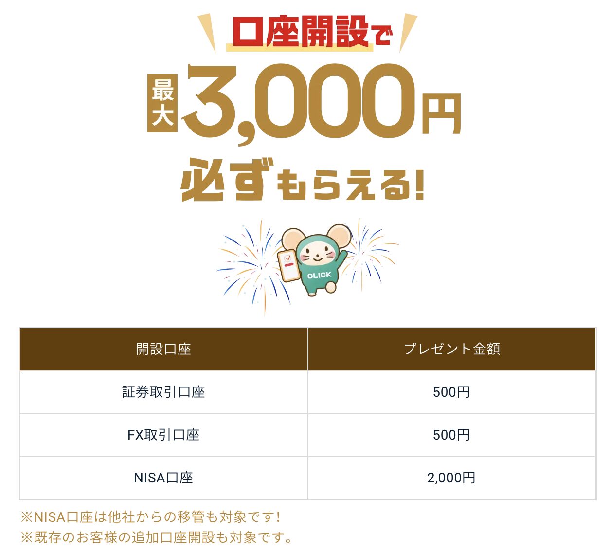 こうした現金プレゼントは、証券取引口座やFX取引口座、NISA口座の開設を組み合わせることによって、付与額が変わるケースがあります。