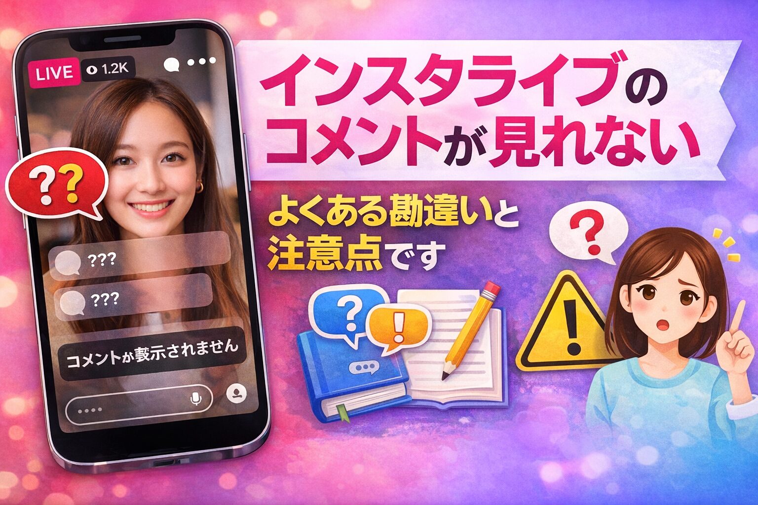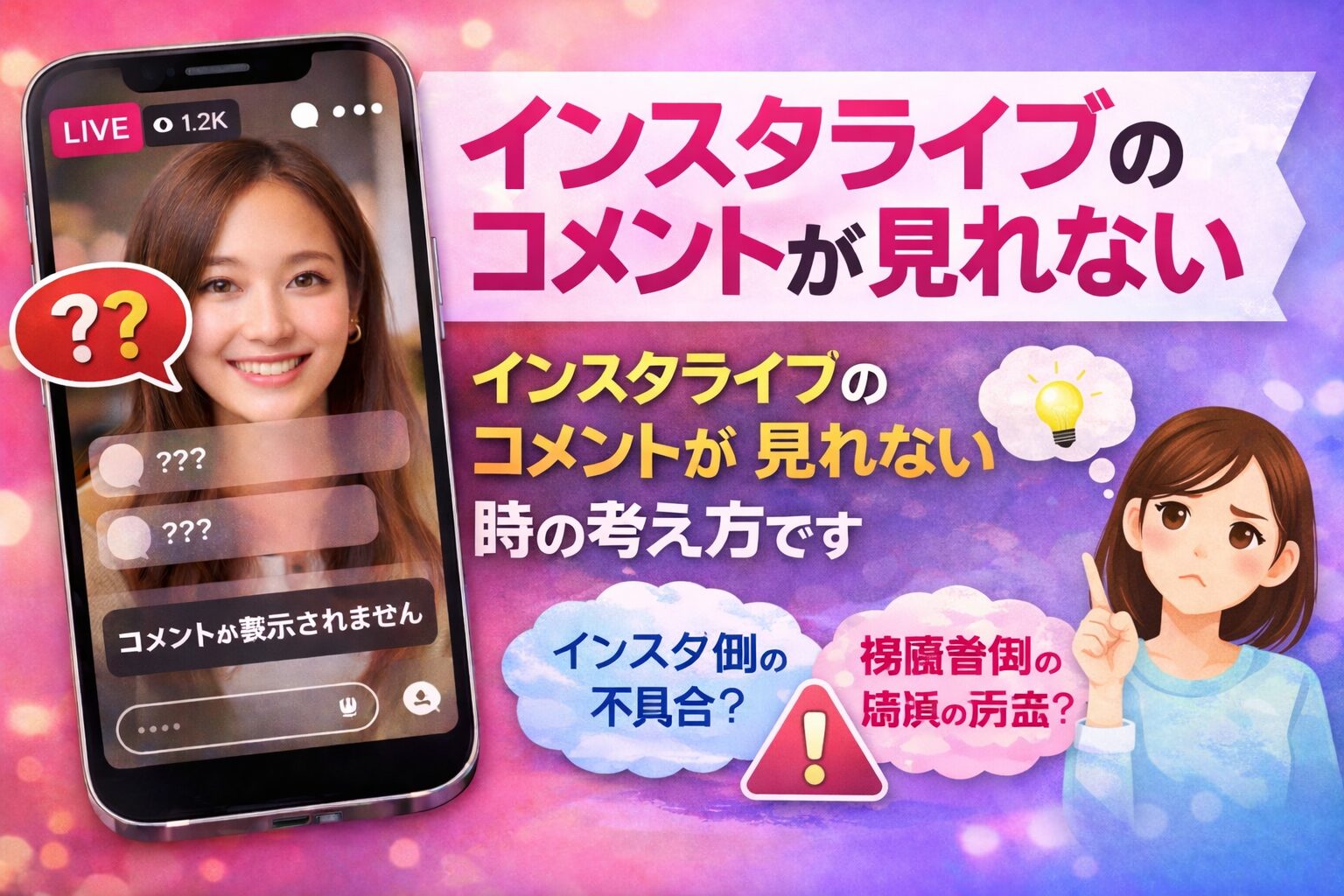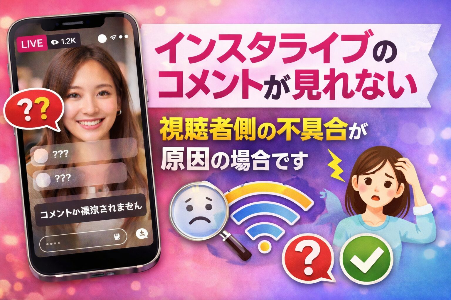 インスタライブのコメントが見れない問題は、突然起きると不安になりますが、原因は大きく分けて配信者側の設定か、視聴者側の不具合のどちらかです。