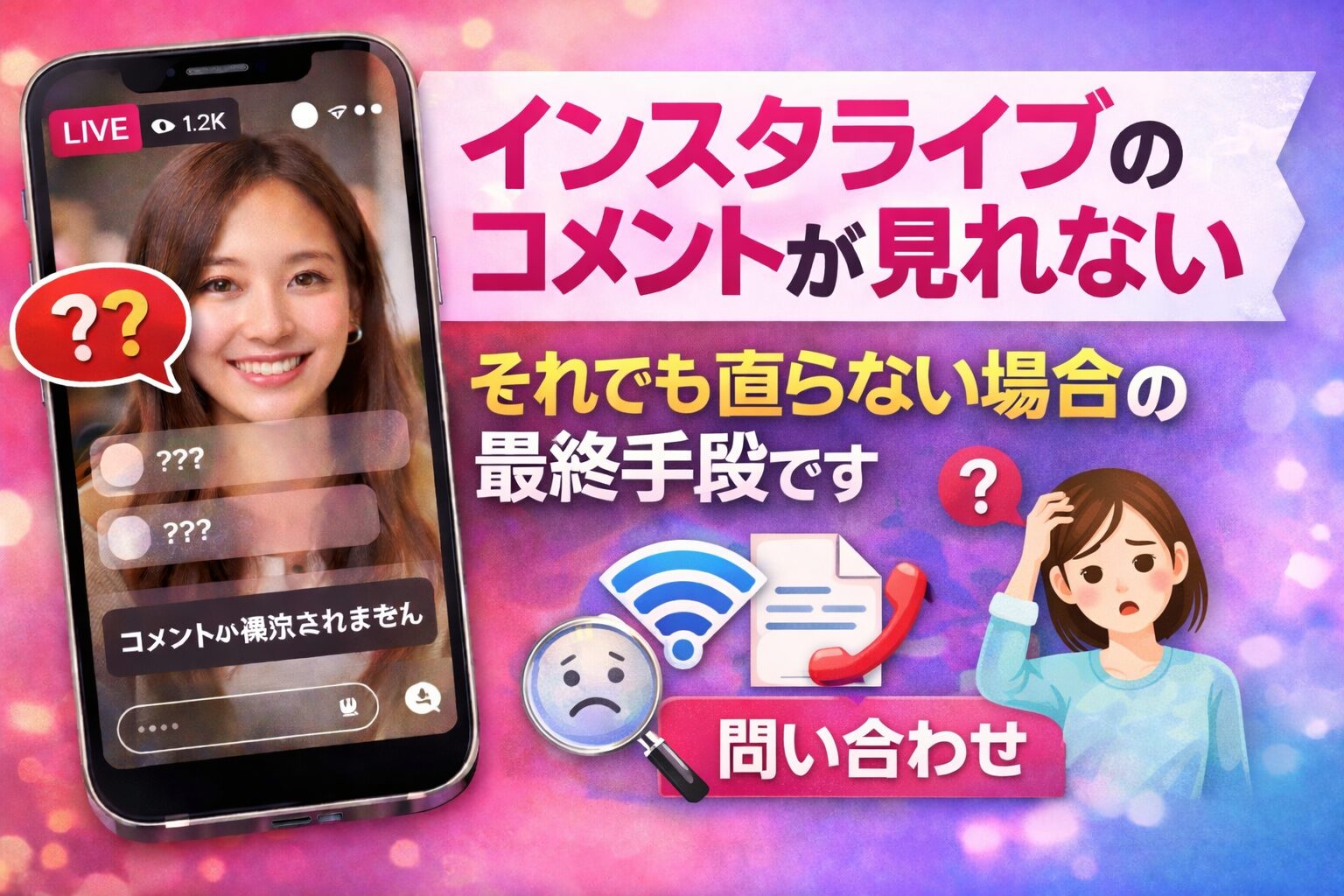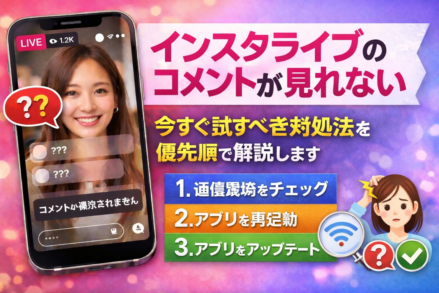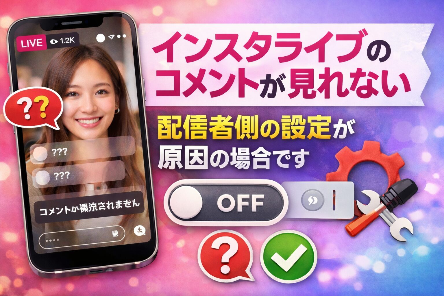 インスタライブのコメントが見れない問題は、突然起きると不安になりますが、原因は大きく分けて配信者側の設定か、視聴者側の不具合のどちらかです。