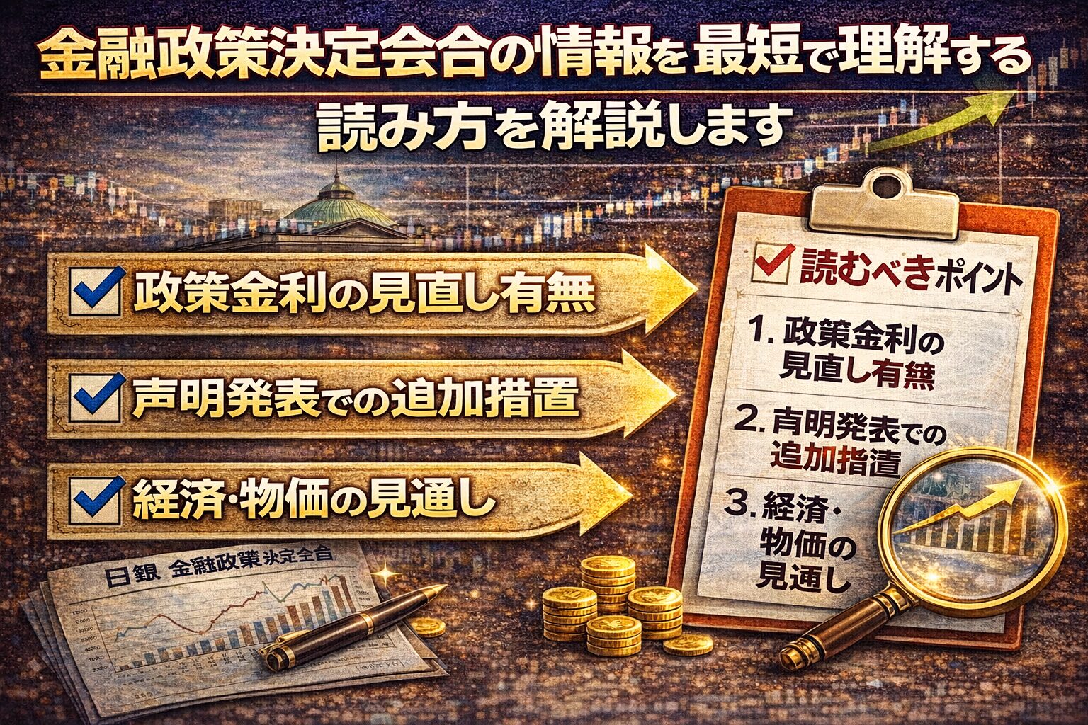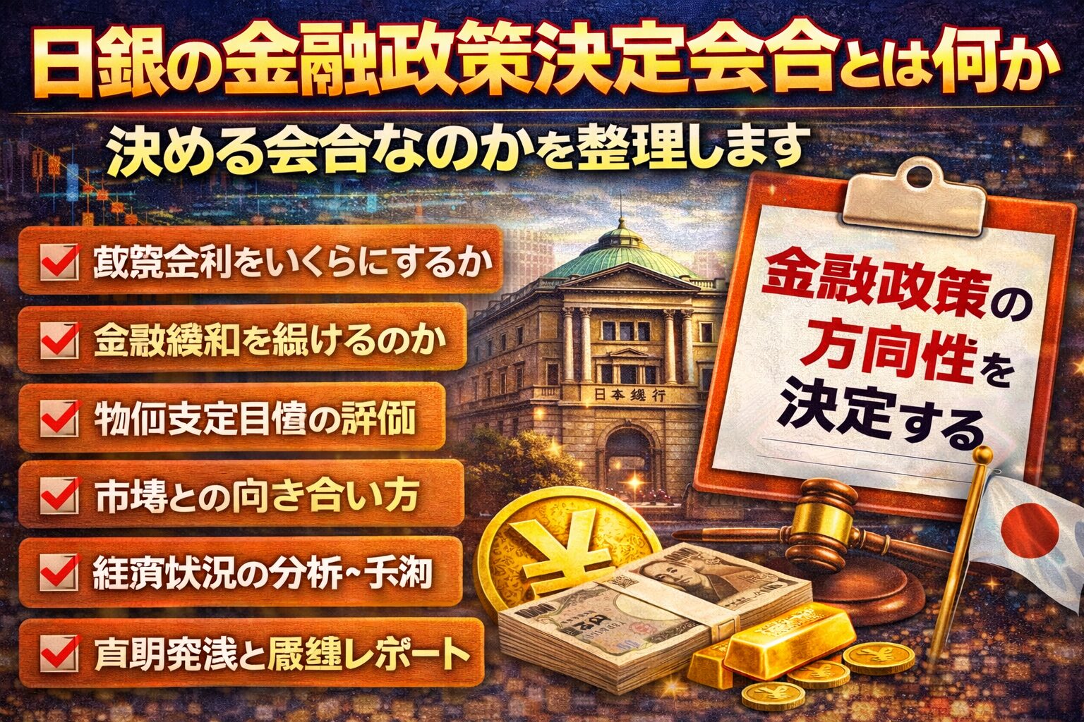 金融政策決定会合は、日銀が景気や物価、金融環境を総合的に判断し、金融政策の方向性を決める公式会合です。