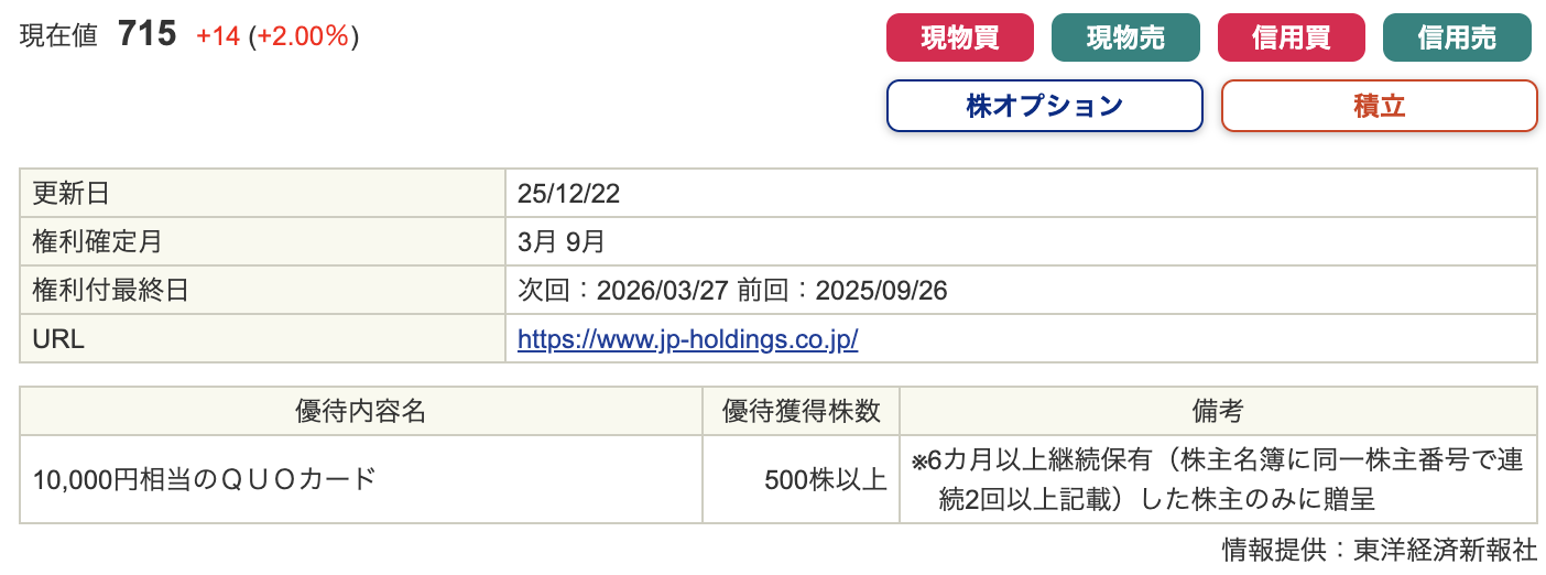 JPホールディングスの株主優待制度は、2025年から新たに導入された制度です。