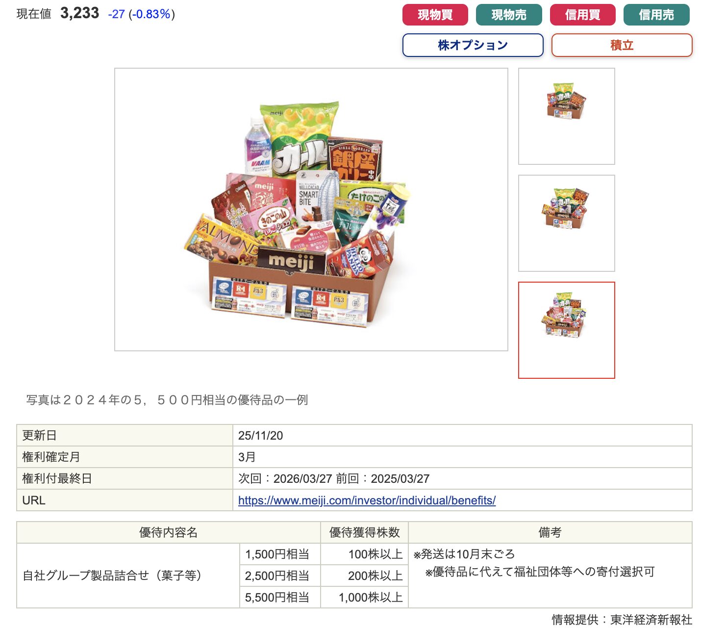 100株以上の保有で1,500円相当、200株以上で2,500円相当、1,000株以上で5,500円相当の明治グループ製品が進呈されます。