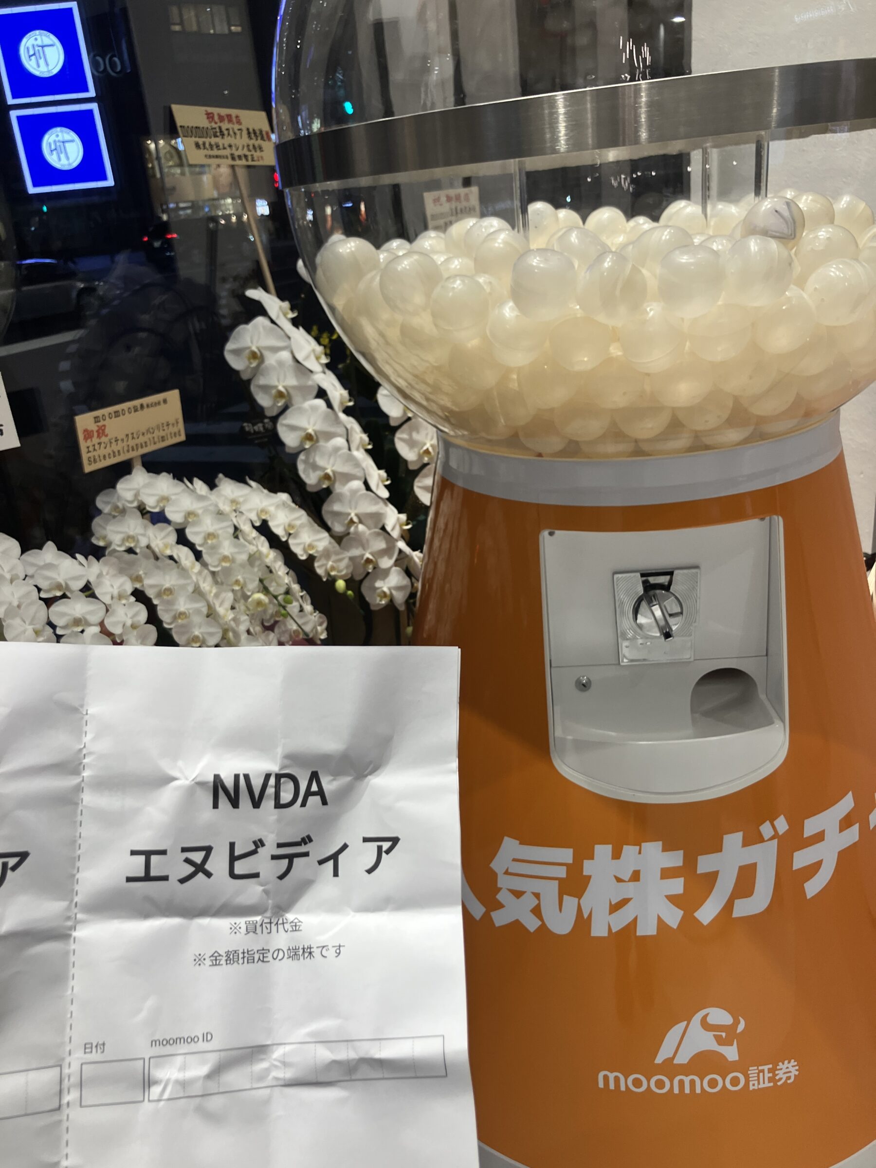 オレンジの筐体には「moomoo証券」のロゴ、そして「人気株ガチャ」の文字。