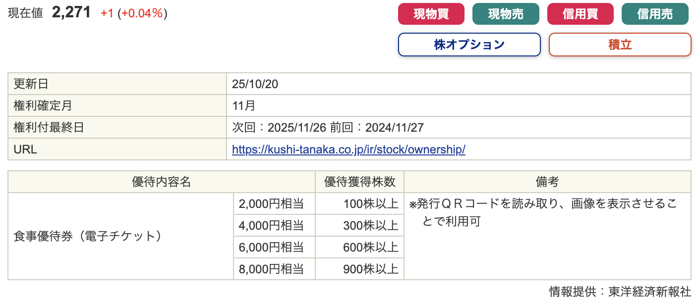 | 串カツ田中HD | 食事券2,000円 | 約20万円 | 約3.5% | 外食×成長性 |
