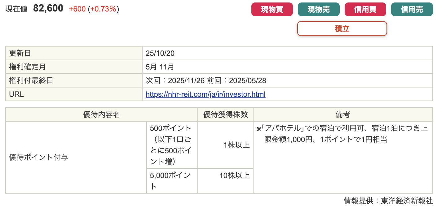 | 日本ホテル&レジデンシャル投資法人 | 宿泊優待券 | 約12万円 | 約5〜6% | 高配当+ホテル割引 |
