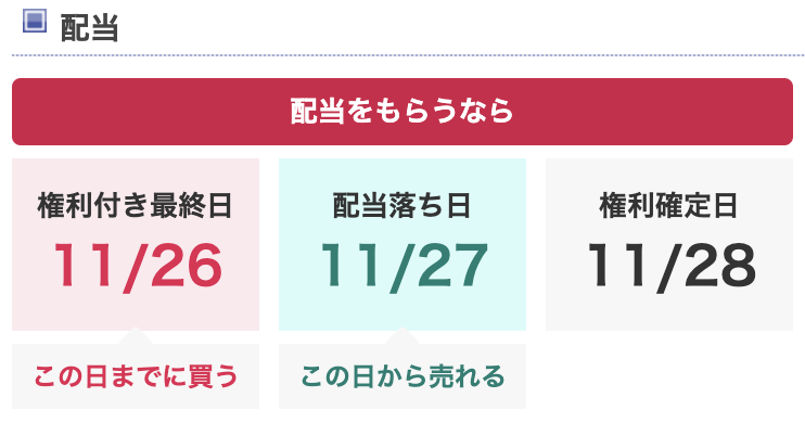 - 権利付き最終日:この日までに株を購入していれば、権利確定日に株主名簿に記載される日。