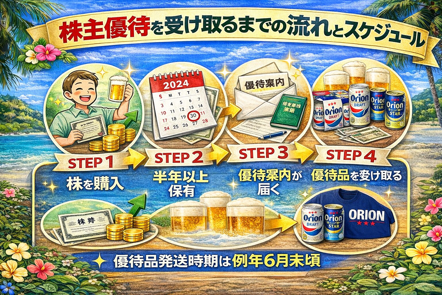 次章では、株主優待を受け取るまでの具体的な流れとスケジュールについて整理します。