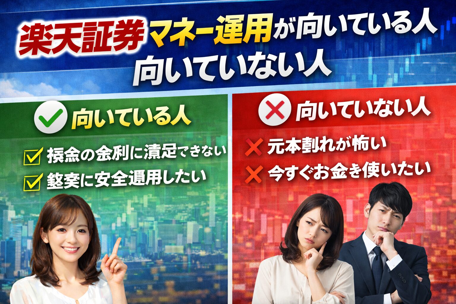 次章では、これらを踏まえたうえで、楽天証券マネー運用が向いている人 向いていない人を具体的に整理します。